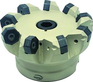 在 45°HEPTA面铣刀 都配备了总共14个切削刃(2×7)双面可转位刀片。锋利的磨削边缘需要较少的主轴功率并且工艺友好。每个边缘都有一个用于高质量表面的磨光阶段。不均匀的节距以及剥离切削过程和良好的平衡是 5 轴加工中心铣削过程的理想环境。