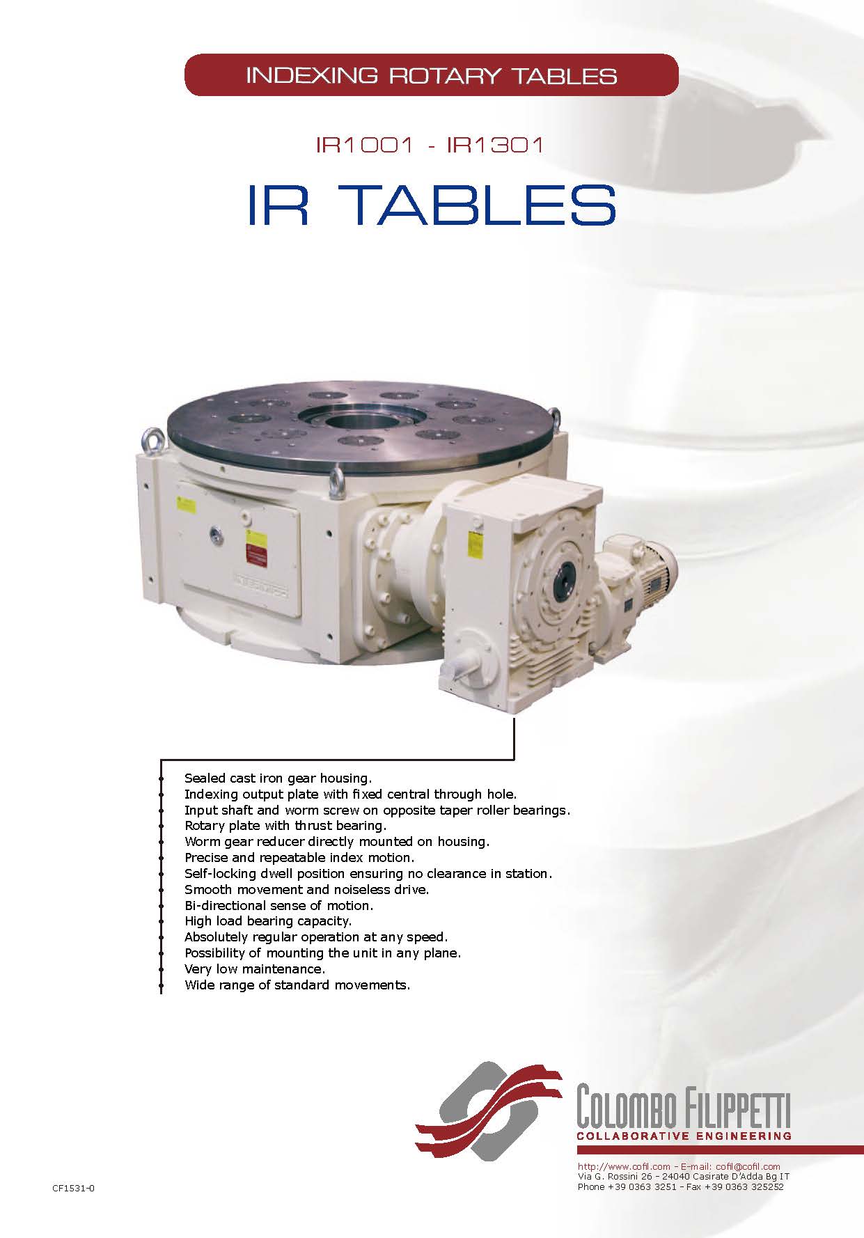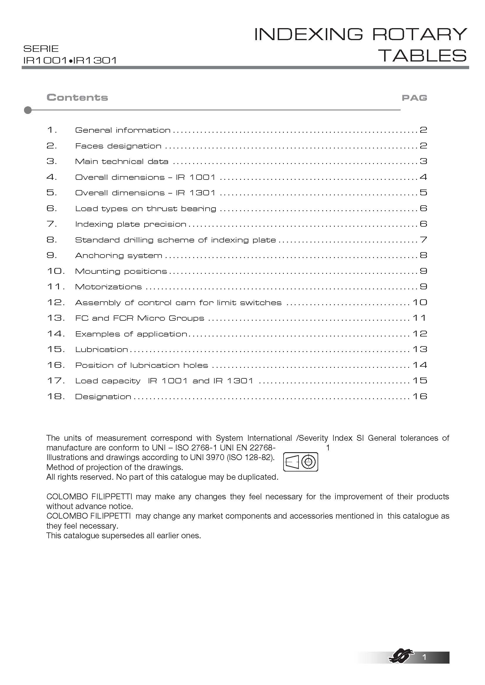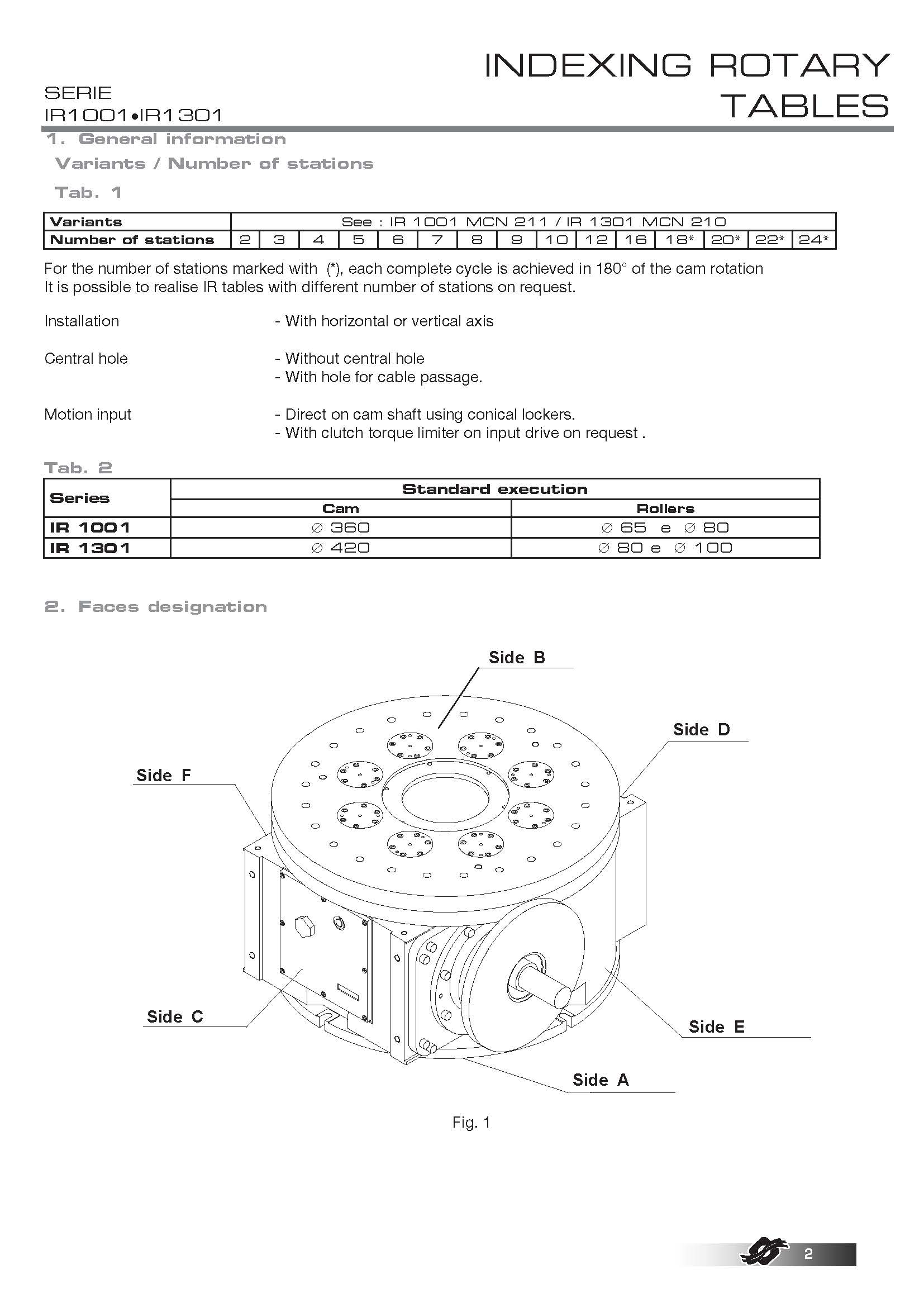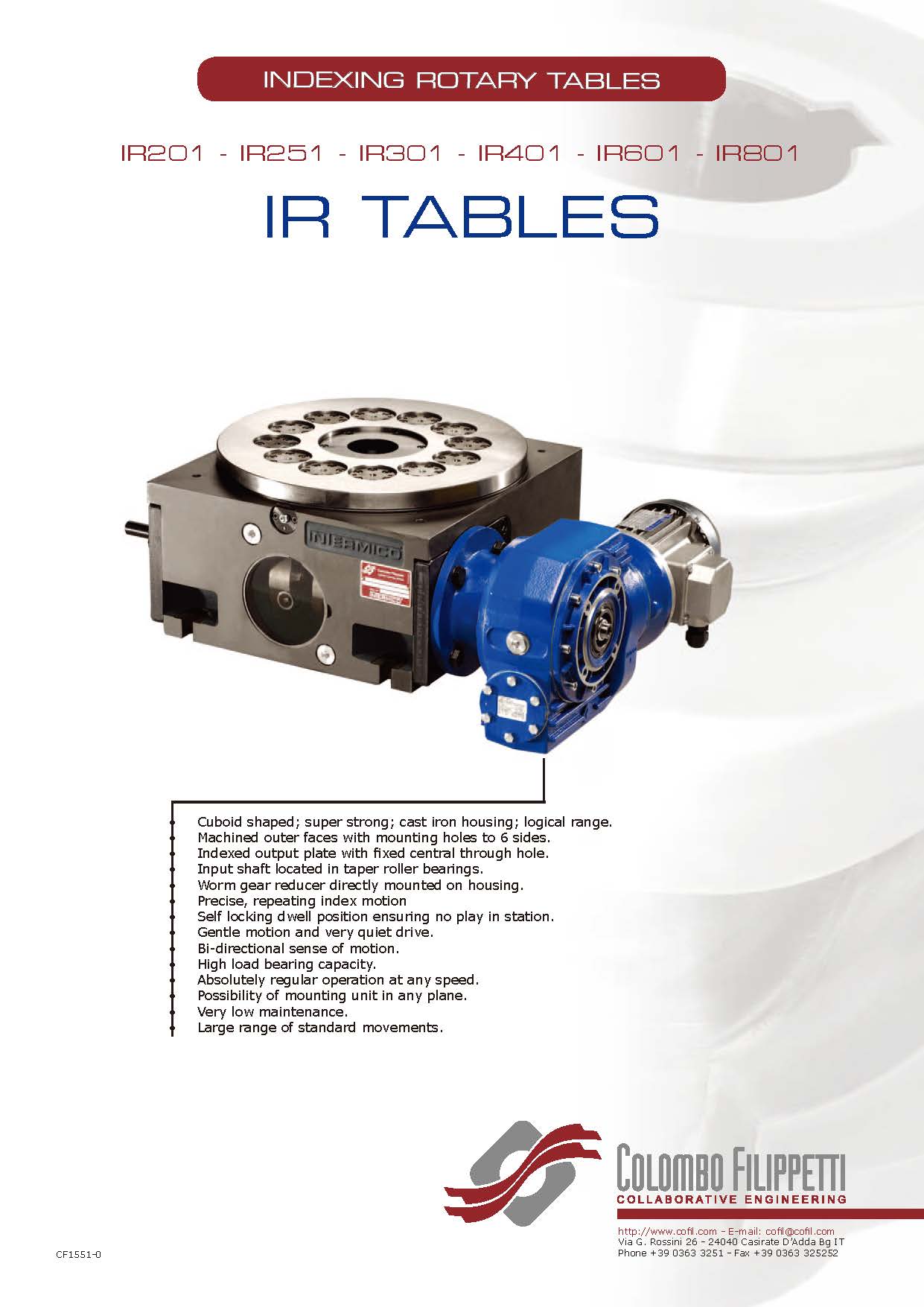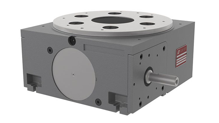 COLOMBO FILIPPETTI spa "IR" Minindex 系列的分度转台是圆柱形凸轮机械装置,可将输入轴的匀速旋转运动转换为输出表盘的分度旋转运动。
