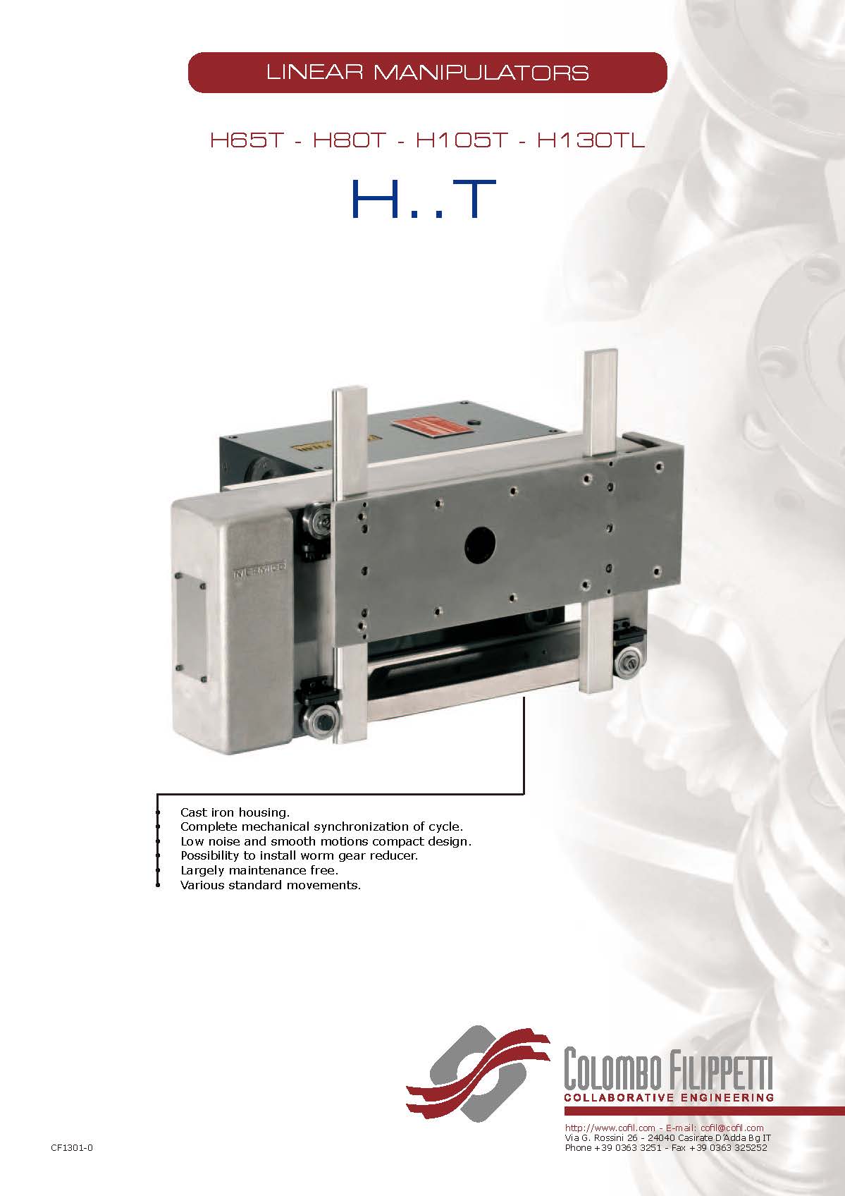 COLOMBO FILIPPETTI spa 的 H.. T 系列线性机械手是共轭双凸轮机构,可将均匀的输入旋转运动转换为典型的“门柱”拾放运动的同步相位 2 轴正交线性运动。