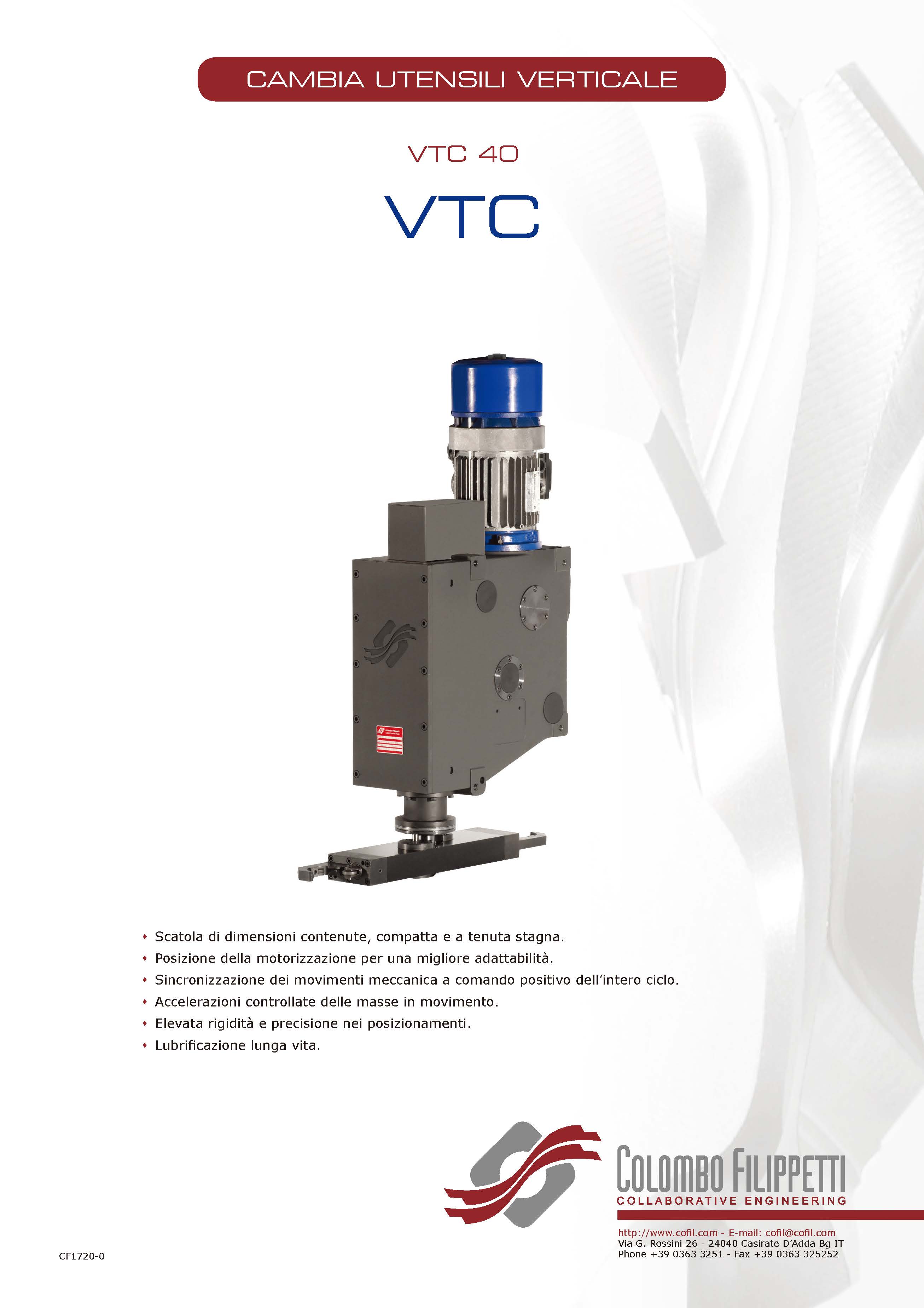 COLOMBO FILIPPETTI spa 的新一代 VTC 立式换刀装置执行 VTC 典型动作,外形尺寸非常有限;它允许在更短的时间内更换工具并具有更高的刚度。目前,仅提供 40 码。